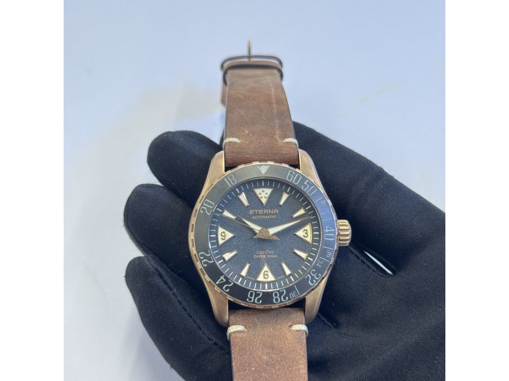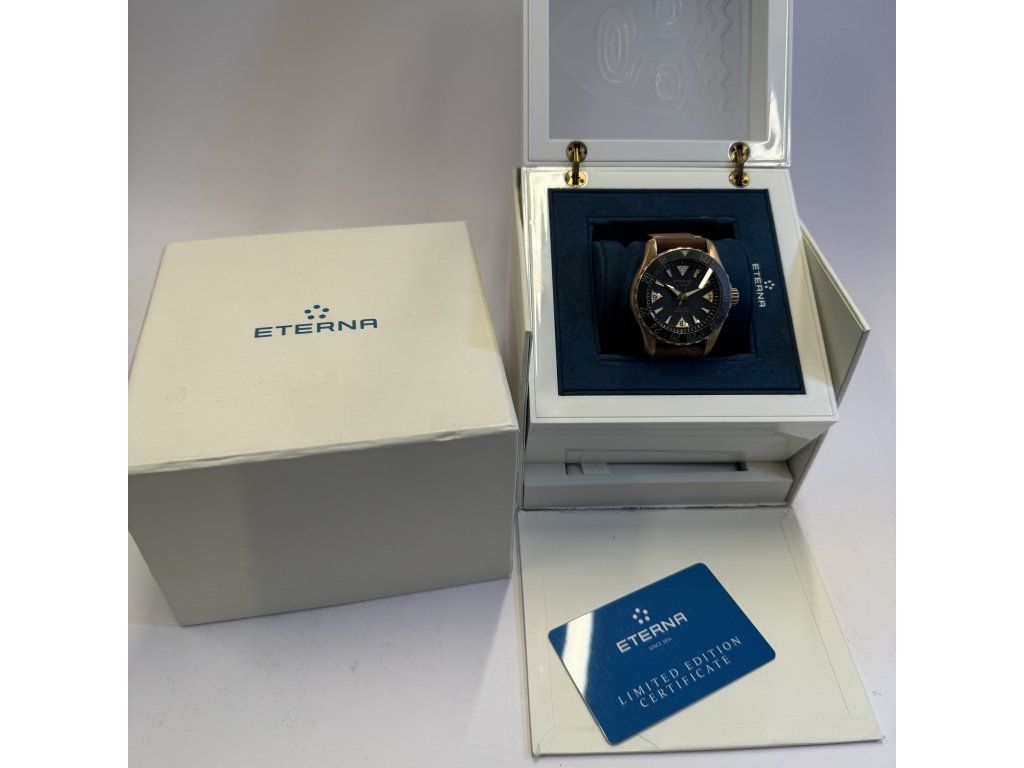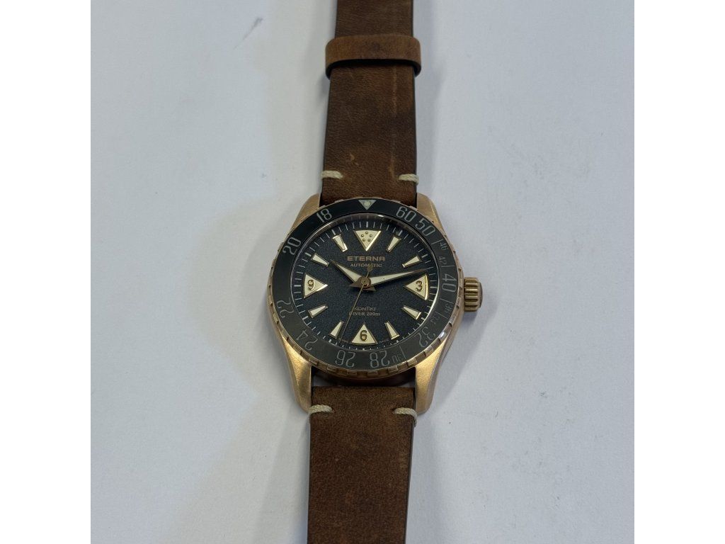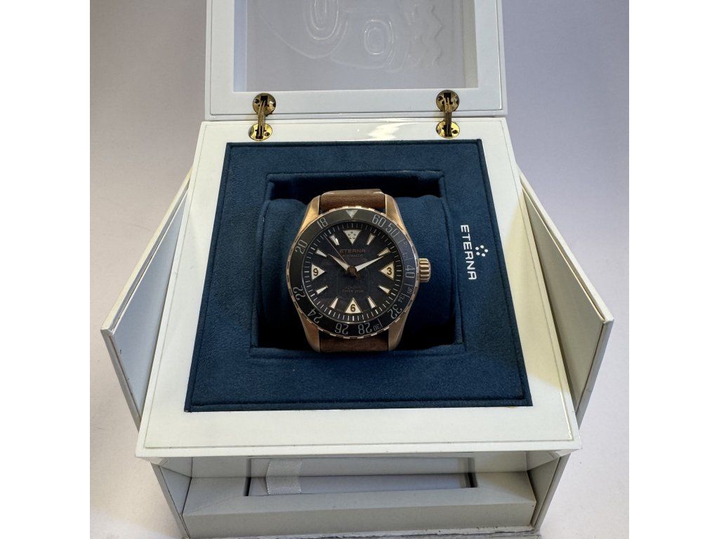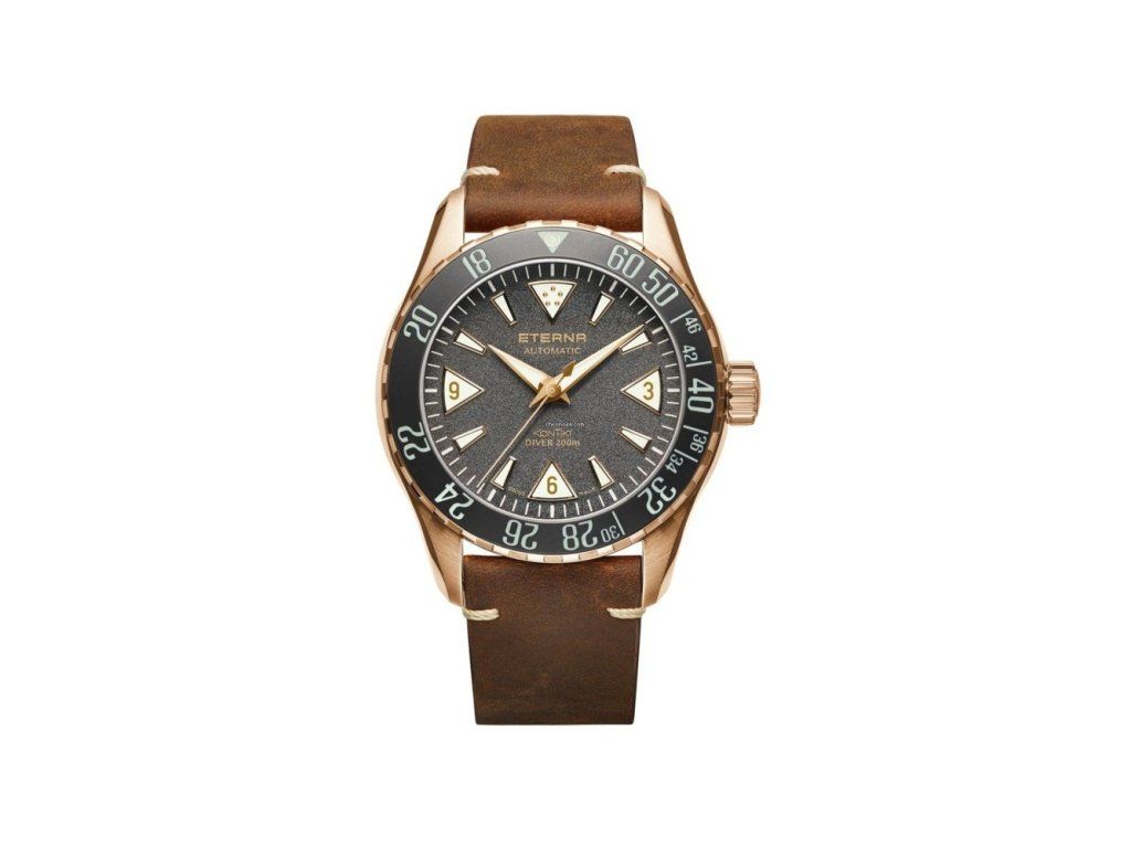 Limitovaná edice expedičních, automatických, potapěčských hodinek v počtu 300 kusů z legendární řady KONTIKI, kterou ETERNA uvedla poprvé v roce 1958 jako poctu a připomínku expedice KonTiki Thora Heyeredahla s nezaměnitelným designem trojúhelníkových indexů. Hodinky jsou uloženy v bronzovém pouzdře. Indexy a ručičky vynikají na tmavě zeleném číselníku. Kožený řemínek z broušené kůže s bronzovou sponou. Hodinky jsou osazeny automatickým manufakturním strojkem 3902A a disponují rezervou chodu 65 hodin.