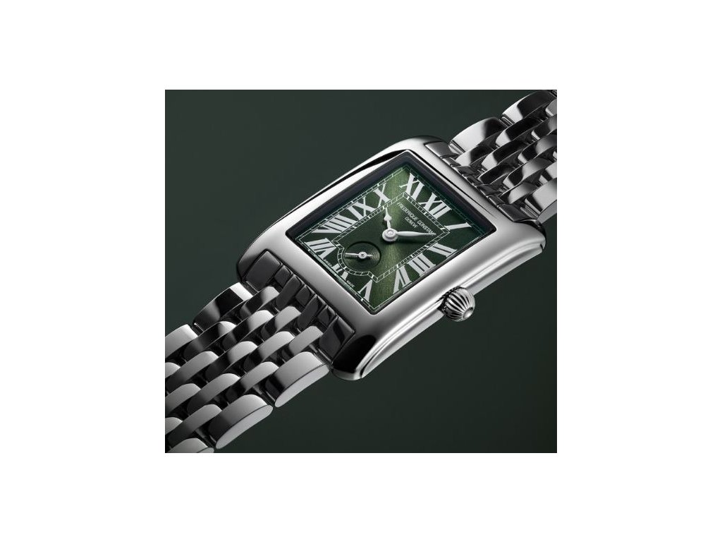 Elegantní hodinky v hranatém ocelovém, který evokuje ducha art deco 20. a 30. let s rovnými, napjatými liniemi, které se vymykají konvenčnímu kruhu. Broušený zelený číselník s římskými číslicemi má na pozici šesté hodiny mimostřednou vteřinovku.