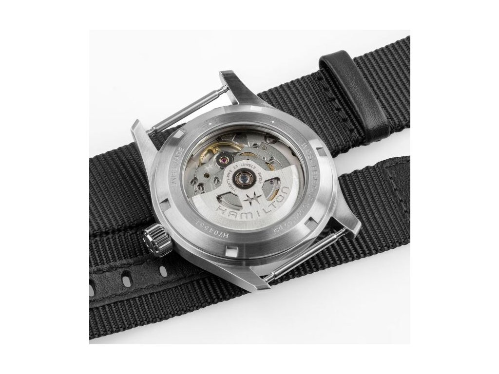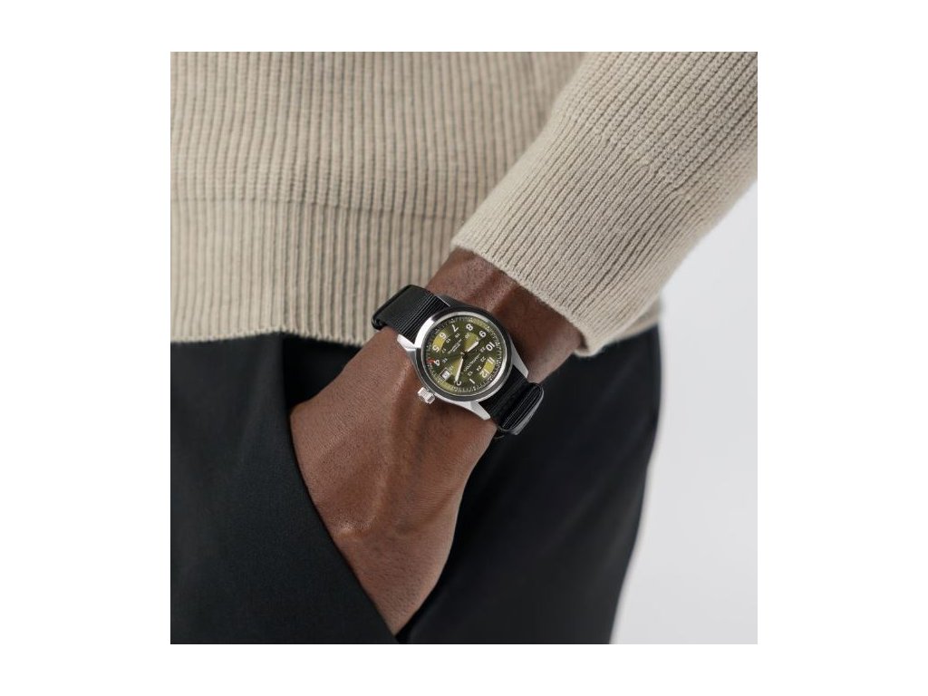 Model Khaki Field Automatic, inspirovaný původními vojenskými hodinkami, spojuje vojenské dědictví se současným designem. Indexy a ručky na číselníku khaki barvy mají luminiscenční nátěr. Hodinky pohání automatický strojek s rezervou chodu 80 hodin a jsou upevněny na textilním řemínku.