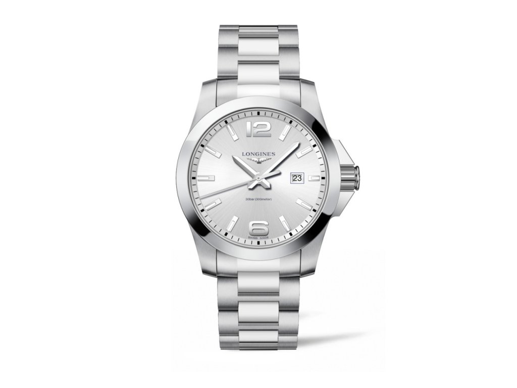 Pánské luxusní sportovně elegantní hodinky Longines Conquest s průměrem pouzdra 43 mm a vodotěsností 300 M. Pouzdro i tah hodinek je vyroben z antialergické oceli 316L, sklíčko je safírové s antireflexní úpravou. Na stříbrném číselníku jsou umístěny stříbrné indexy, ručky jsou pokryty Super-LumiNovou, na pozici čísla 3 je ukazatel data, šroubovací korunka. Hodinky jsou poháněny bateriovým strojkem s fukcí EOL - ukazatel životnosti baterie.