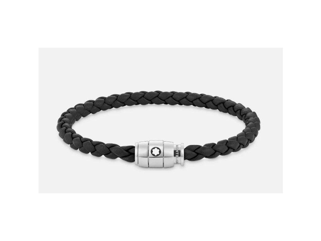 Náramek tkaný z černé kůže s magnetickou sponu z leštěné nerezové oceli s logem Montblanc.
