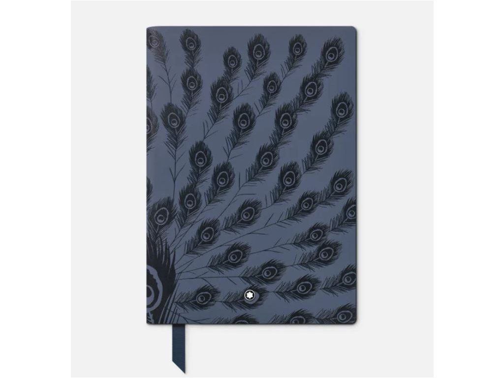Zápisník z modré kůže s lesklým digitálním potiskem pavích per inspirovaným obálkou slavných románů Jane Austen.