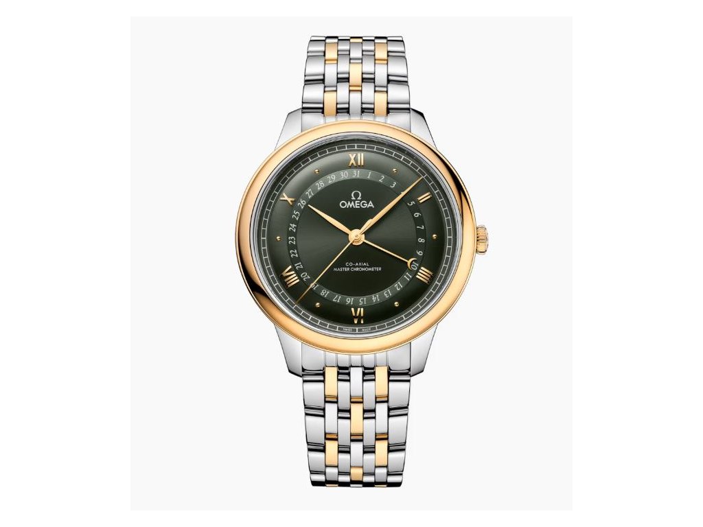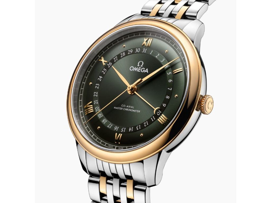 Společenské pánské hodinky v pouzdře v kombinaci nerezové oceli a žlutého zlata. Výrazným prvkem na tmavě zeleném číselníku je mezikruží s arabskými číslicemi - ukazatel data, které zobrazuje centrální ručička se zakončením ve tvaru půlměsíce z PVD žlutého zlata. Hodinky jsou upevněné na náramku z nerezové oceli a zlata a jsou poháněny koaxiálním Master Chronometer kalibrem 8936, který je viditelný skrze zadní dýnko pouzdra.
