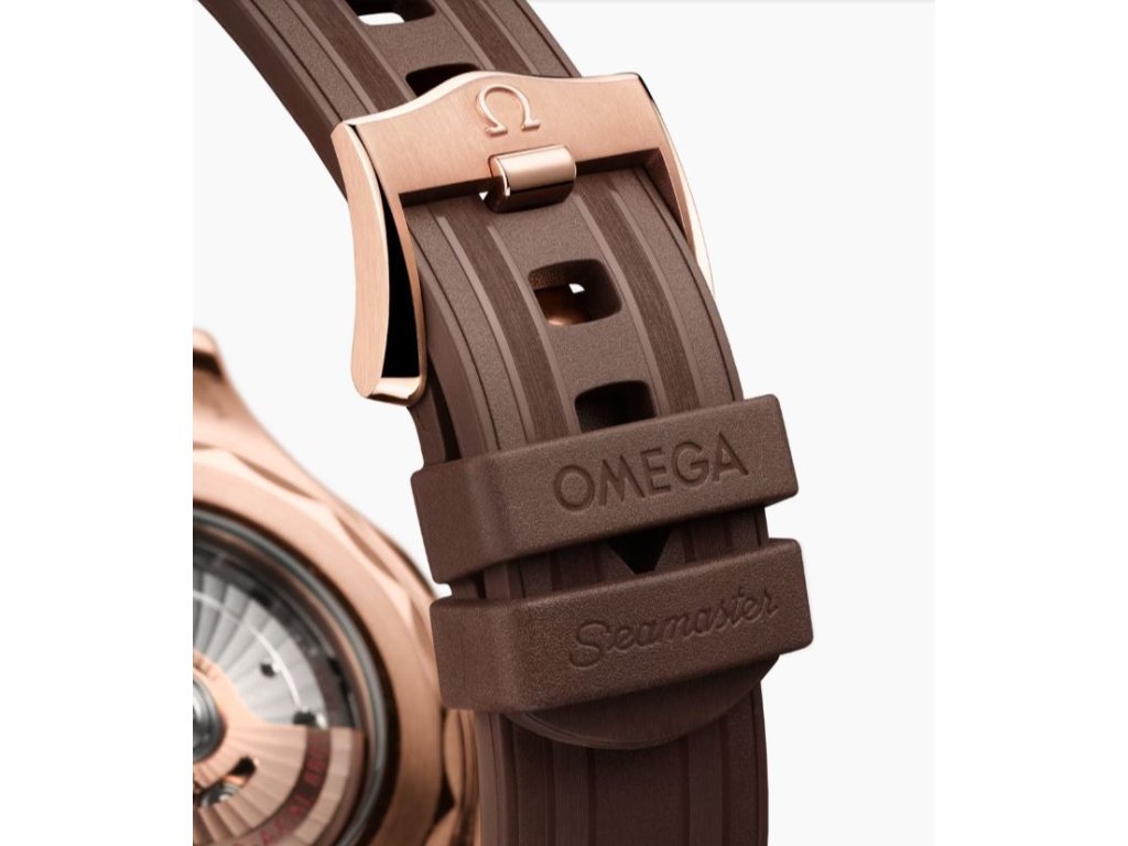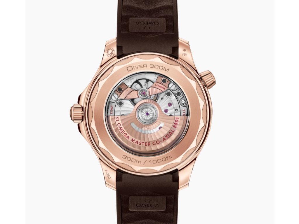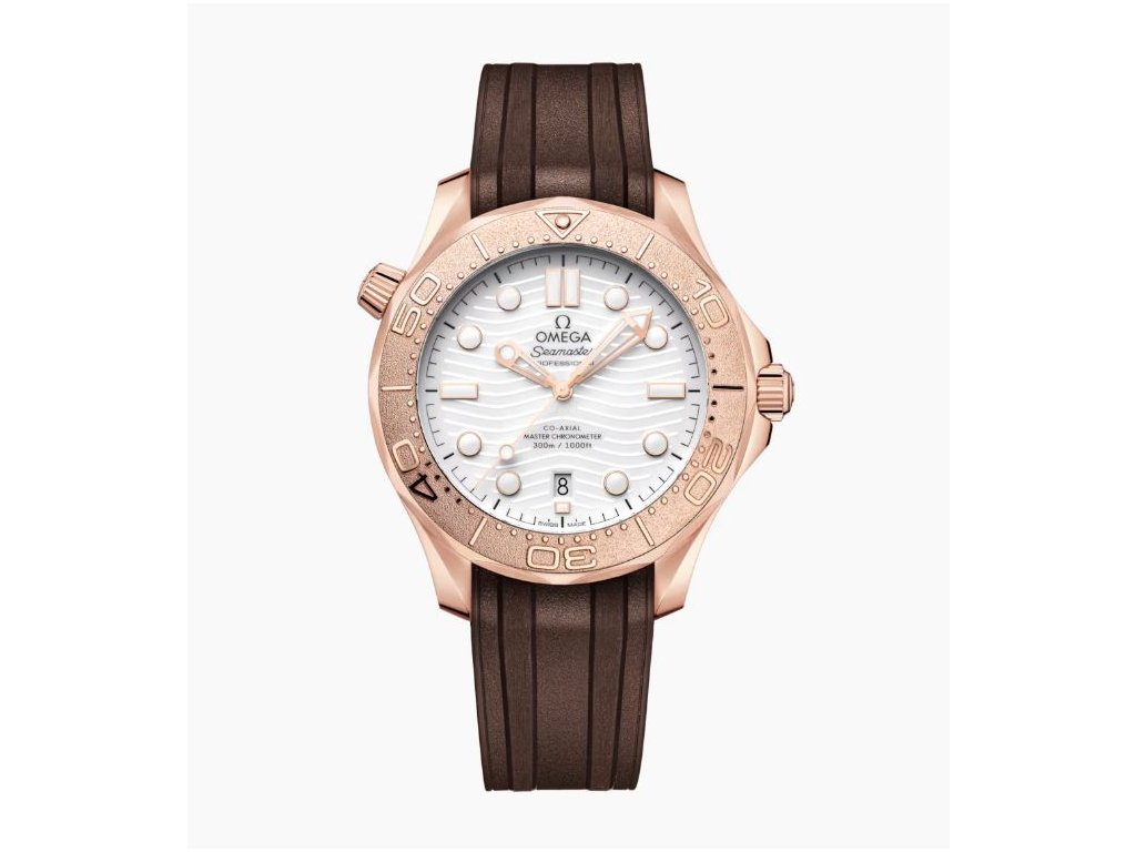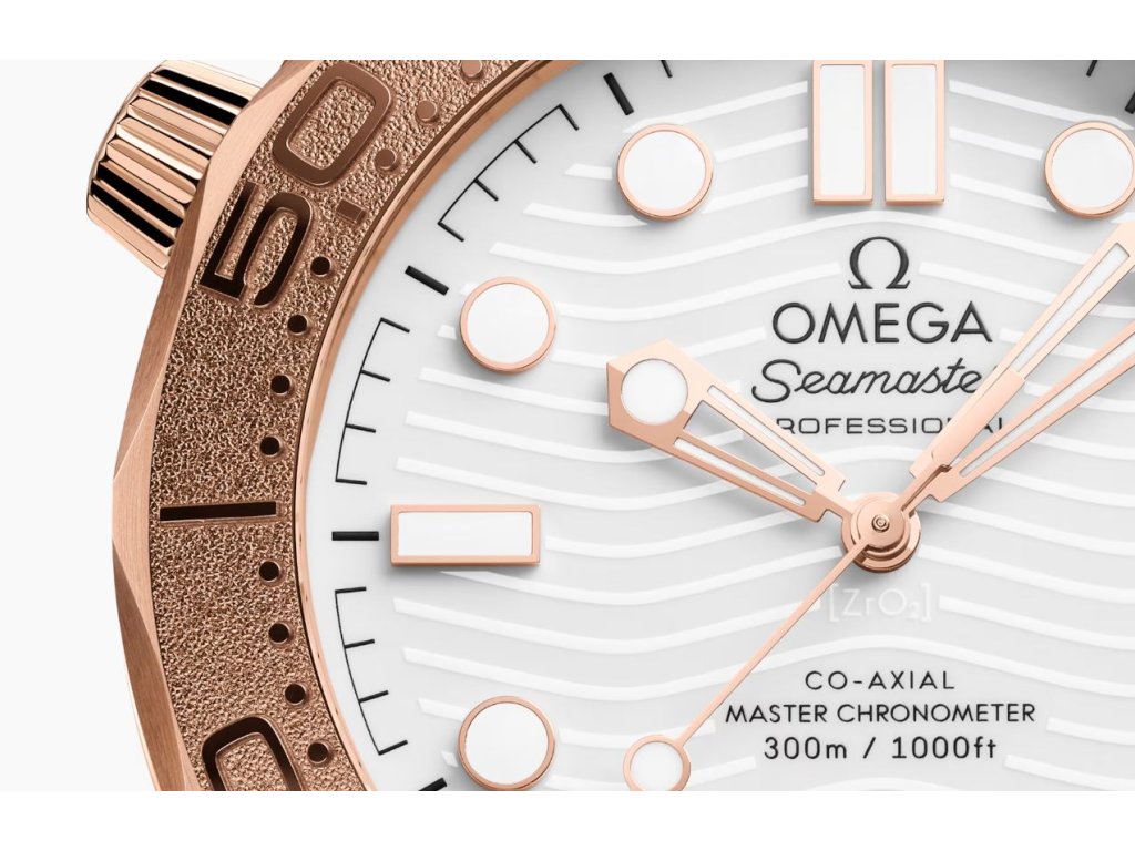 Model Seamaster Diver 300M ve zlatém pouzdře s lunetou s potápěčskou stupnicí. Číselník z bílé keramiky s vlnovým vzorem je vybaven skeletonizovanými ručičkami a indexy z 18K Sedna™ vyplněnými bílou luminiscenční vrstvou Super-LumiNova. Hodinky jsou poháněny strojkem OMEGA Co-Axial Master Chronometer Calibre 8801, který je viditelný skrze zadní safírové sklo pouzdra.