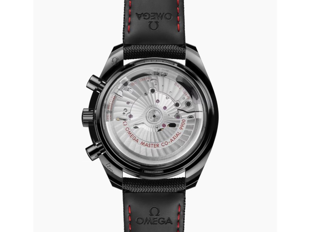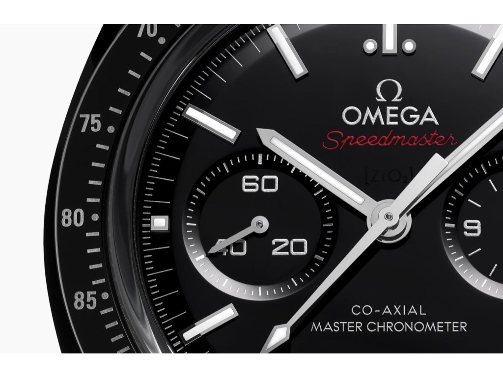 Hodinky Speedmaster Dark Side of the Moon ctí odkaz společnosti OMEGA v oblasti vesmírného výzkumu. Vyznačují se pouzdrem z leštěné kartáčované černé keramiky s leštěnou keramickou lunetou, která je opatřena tachymetrickou stupnicí z materiálu Liquidmetal™. Hodinky mají leštěný keramický číselník s indexy a ručičkami z 18ti karátového bílého zlata, které jsou vyplněny světle zeleným povlakem Super-LumiNova. Hodinky pohání automatický strojek OMEGA Co-Axial Master Chronometer Calibre 9900 a jsou upevněny na nylonovém řemínku s černou pryžovou podšívkou a keramickou překlápěcí sponou.