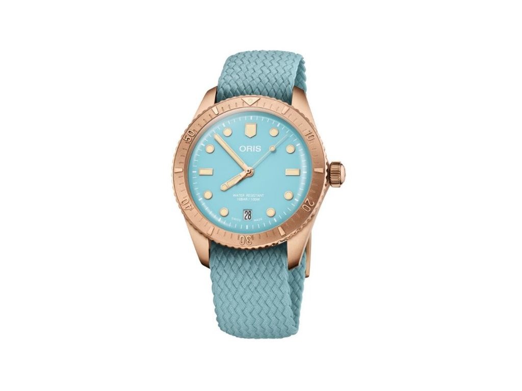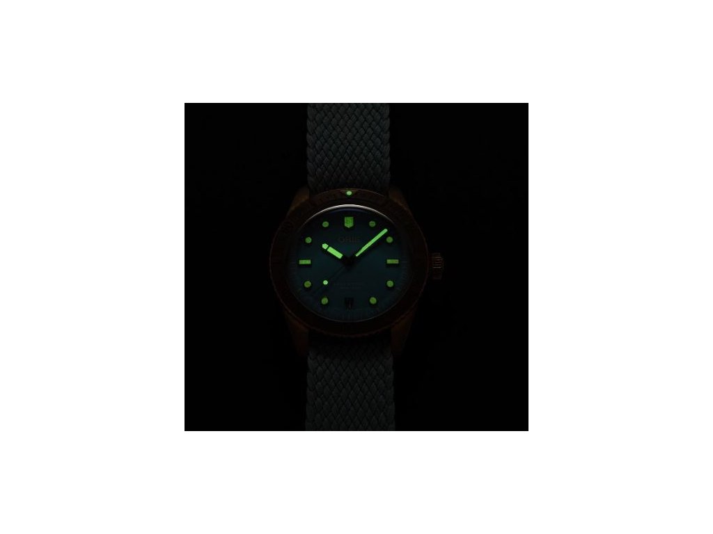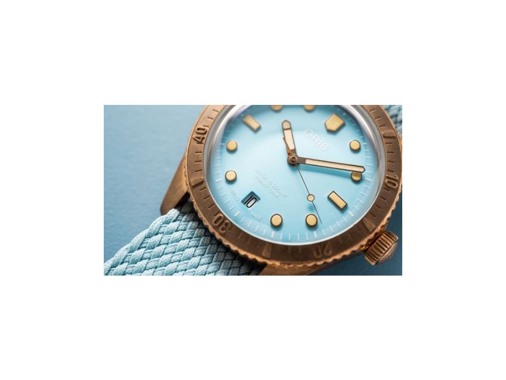 Sportovně elegantní hodinky v bronzovém pouzdře s jednosměrně otočnou lunetou s potápěčskou stupnicí. Světle modrý číselník doplňují indexy a ručky s luminiscenční výplní. Hodinky pohání automatický strojek s rezervou chodu 38 hodin a jsou upevněny na textilním řemínku z recyklovaného materiálu.