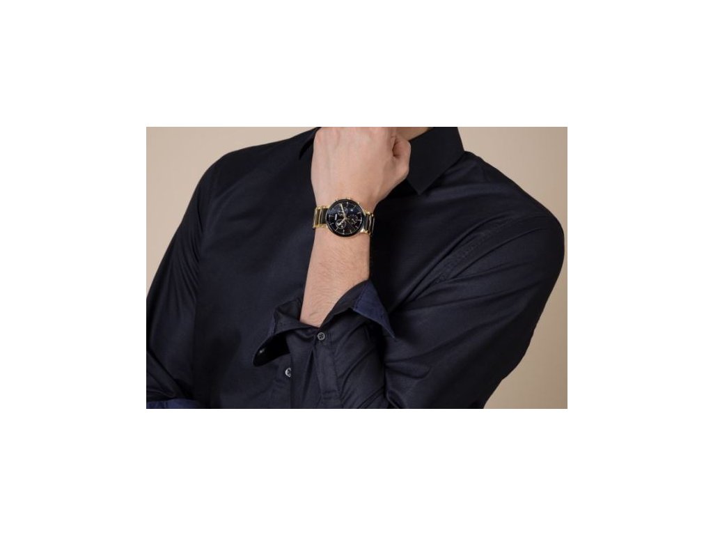 Sportovněelegantní hodinky v ocelovém pouzdře se zlatou PVD povrchovou úpravou poháněné quartzovým strojkem. Černý broušený číselník má aplikované indexy a ručky s bílým povrchem SuperLumiNova®. Hodinky jsou upevněny na náramku z leštěné nerezové oceli s černými high-tech keramickými středovými články.