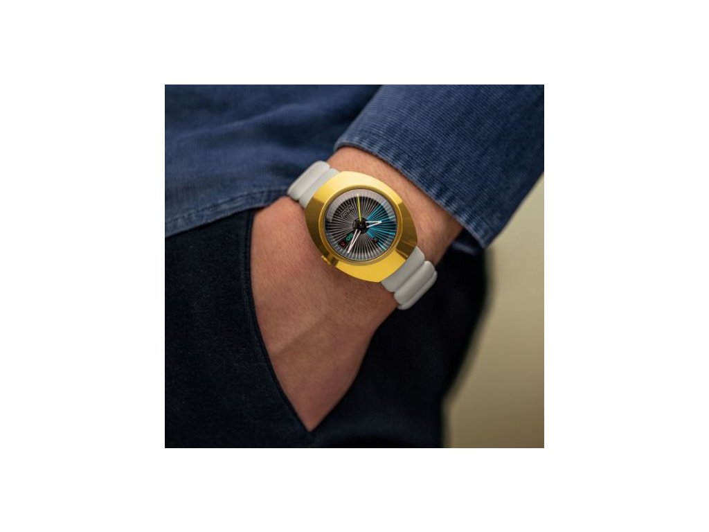 Model DiaStar Original ze speciální edice vyrobené ve spolupráci se světoznámým průmyslovým designérem Tej Chauhanem. Hodinky jsou uloženy v ocelovém pouzdře se zlatou PVD povrchovou úpravou orámovaném leštěnou lunetou Ceramos™. Na černém číselníku s modrými a stříbrnými detaily vynikají ručičky s bílým povrchem Super-LumiNova® a neonově žlutá vteřinová ručka.Hodinky pohání automatický strojek s rezervou chodu 80 hodin a jsou upevněny na pryžovém řemínku ve tvaru polštářků.
