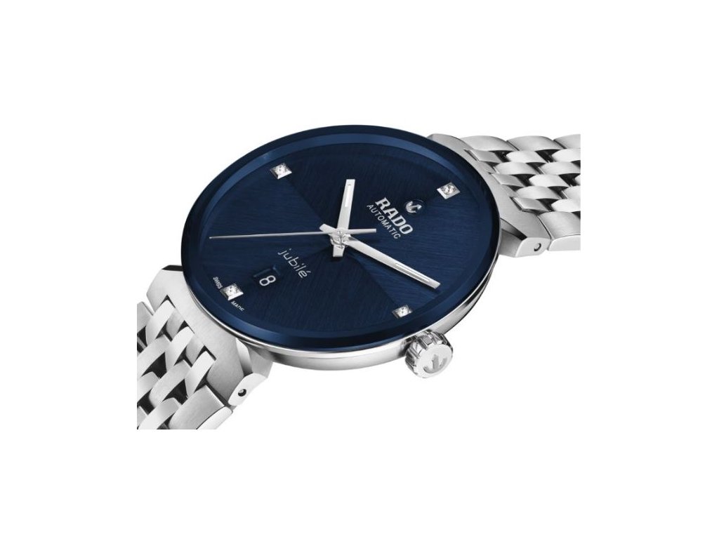 Elegantní hodinky v ocelovém poudře poháněné automatickým strojkem s rezervou chodu 80 hodin. Na tmavě modrém obousměrně kartáčovaném číselníku zdobeném čtyřmi brilianty vynikají ručky s luminiscenční výplní. Pouzdro hodinek je upevněno na náramku z nerezové oceli s kartáčovanými a leštěnými články.