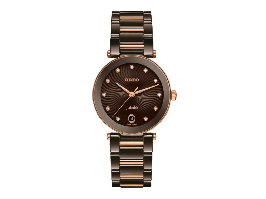 Dámské společenské hodinky v keramickém pouzdře. Hnědý číselník s vlnovým vzorem je zdoben 11ti briliantovými indexy. Model je upevněn na náramku z keramiky a prvky z oceli s PVD povrchovou úpravou v barvě růžového zlata.