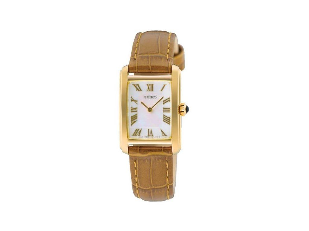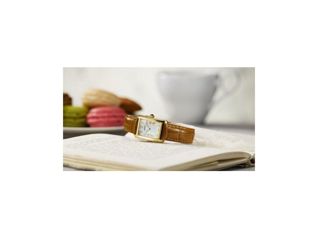 Elegantní hodinky v obdélníkovém ocelovém pouzdře se zlatou PVD povrchovou úpravou s korunkou osazenou kabošonem. Pouzdro je upevněno na koženém řemínku s trnovou sponou.