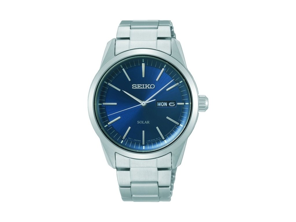 Klasické pánské hodinky v ocelovém pouzdře, které pohánění solární bateriový strojek V158. Na modrém broušeném číselníku vynikají jemné leštěné hodinové indexy a ručičky stříbrné barvy.