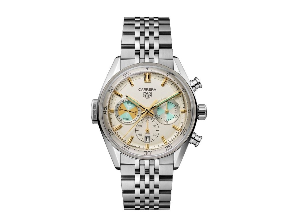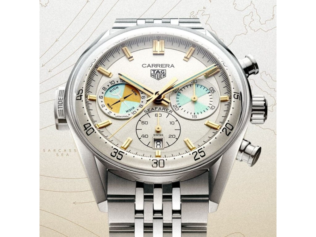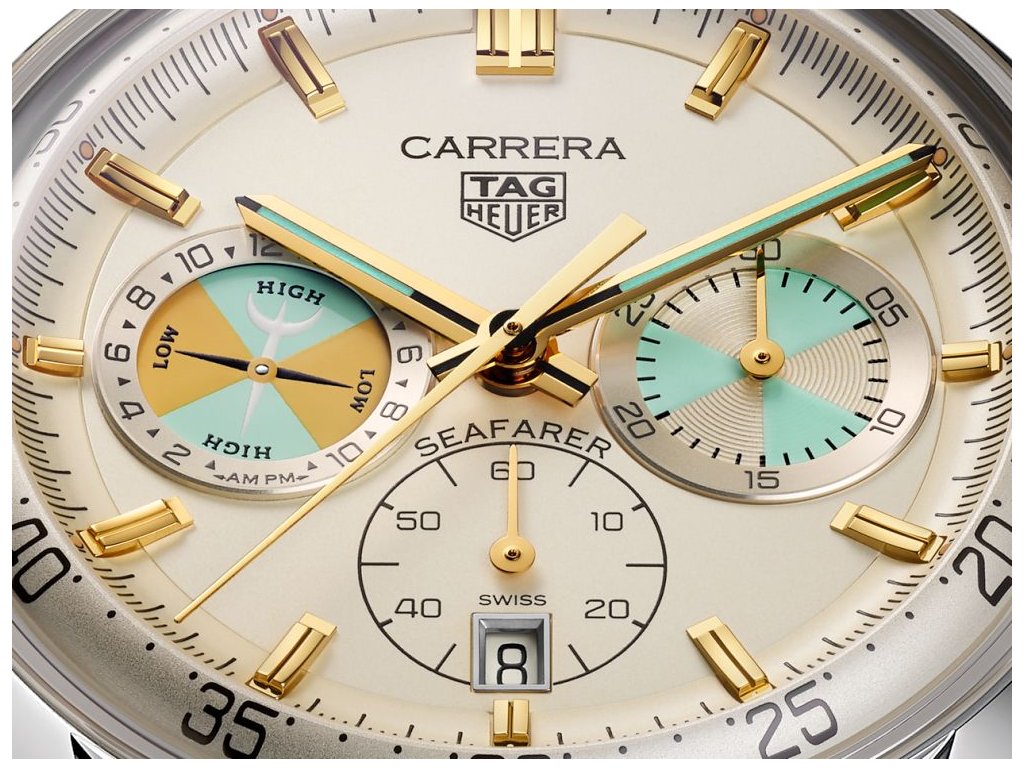 Tento model, inspirován jedněmi z historických hodinek TAG Heuer Seafarer, oživuje jachtařský odkaz této značky moderním nádechem. Výrazný design inspirovaný námořnictvem, umocněný náhradním textilním řemínkem s modrým prošíváním a novým kalibrem TH20-04 s komplikací ukazatele přílivu a odlivu, zachycuje průkopnického ducha, který spojuje moře a přesné měření času. Béžový číselník doplňují tyrkysové a žluté akcenty, inspirované historickým modelem Heuer Seafarer vyrobeným pro Abercrombie & Fitch. Ukazatel přílivu a odlivu na pozici deváté hodiny, ovládaný tlačítkem „TIDE“, ukazuje očekávaný čas dalšího přílivu nebo odlivu.