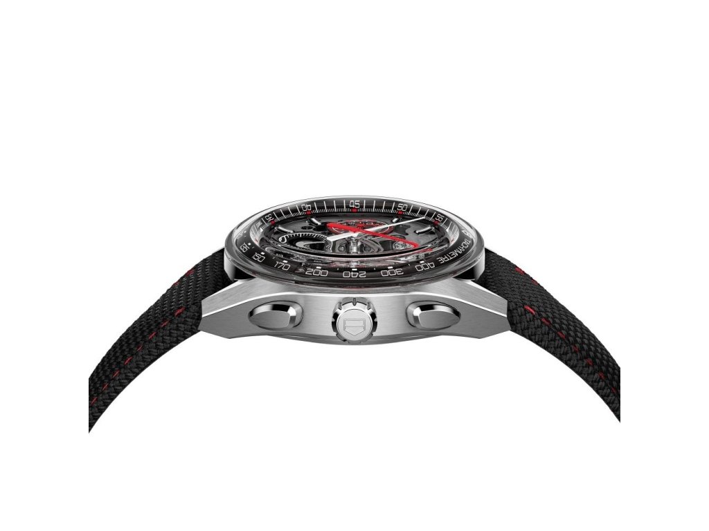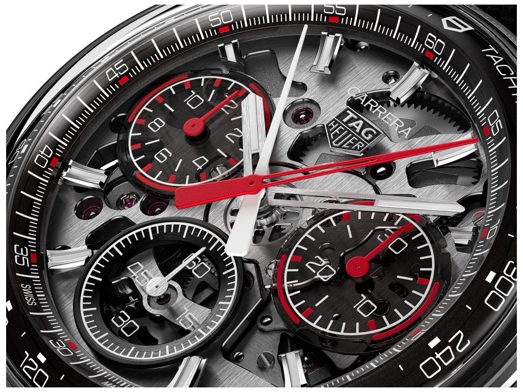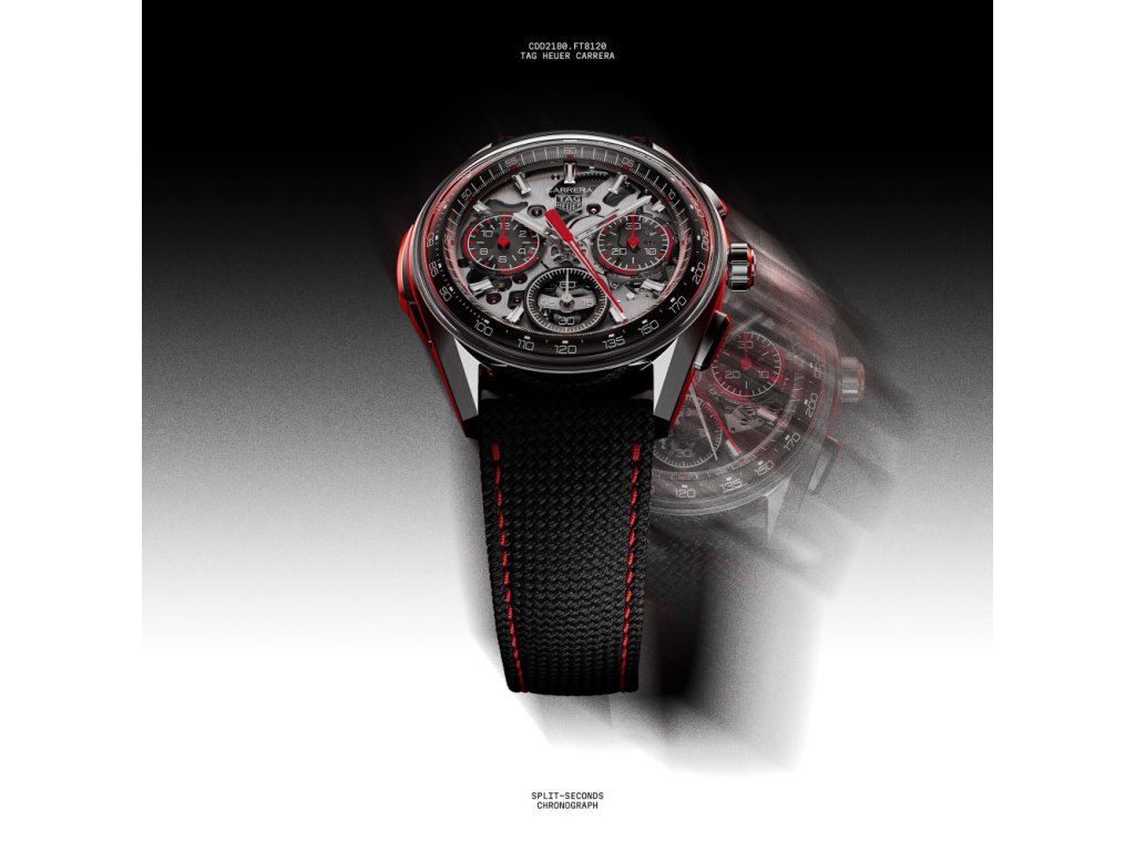 TAG Heuer Carrera Split-Seconds Chronograph kombinuje elegantní proporce s mechanickou dokonalostí. Hodinky jsou uloženy v titanovém pouzdře a jsou poháněny automatickým strojkem Calibre TH81-01, který nabízí výjimečnou přesnost chronografu díky mechanismu s měřeným časem na zlomky sekundy, který měří dva časy současně. Díky konstrukci se safírovým sklem na přední i zadní straně hodinek vytvářejí iluzi plovoucího strojku, což zdůrazňuje propracované můstky zdobené charakteristickým šachovnicovým vzorem vlajky. Každé hodinky jsou individuálně číslovány a jsou dodávány ve speciálním luxusním boxu.