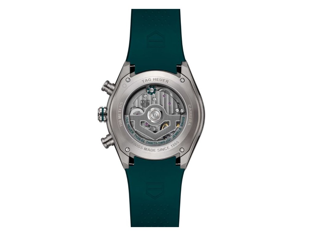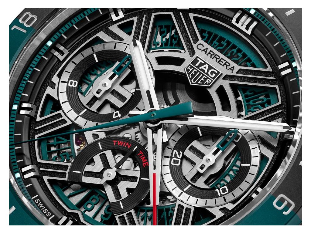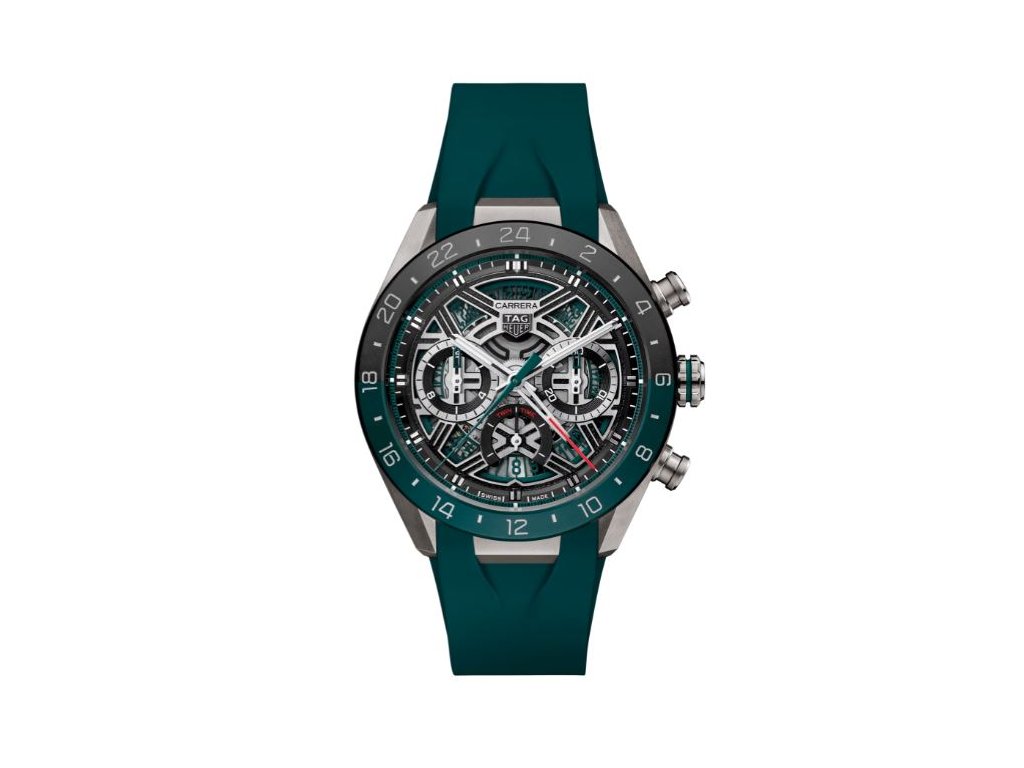 Sportovní hodinky v titanovém pouzdře s pevnou dvoubarevnou keramickou lunetou s 24hodinovou stupnicí v designu inspirovaném motorsportem. Černá příruba s tyrkysově zeleným obrysem na skeletovém číselníku se doplňuje s červenou a tyrkysovou lakovanou ručičkou, které zajišťují dobrou čitelnost. Symbol vítězného věnce na zadní straně pouzdra symbolizuje odkaz triumfů TAG Heuer v motoristickém sportu. Hodinky pohání automatický strojek s rezervou chodu 80 hodin a jsou upevněny na tyrkysovém kaučukovém řemínku s titanovou skládací sponou se systémem jemného nastavení, které nabízí ergonomické nošení pro celý den.