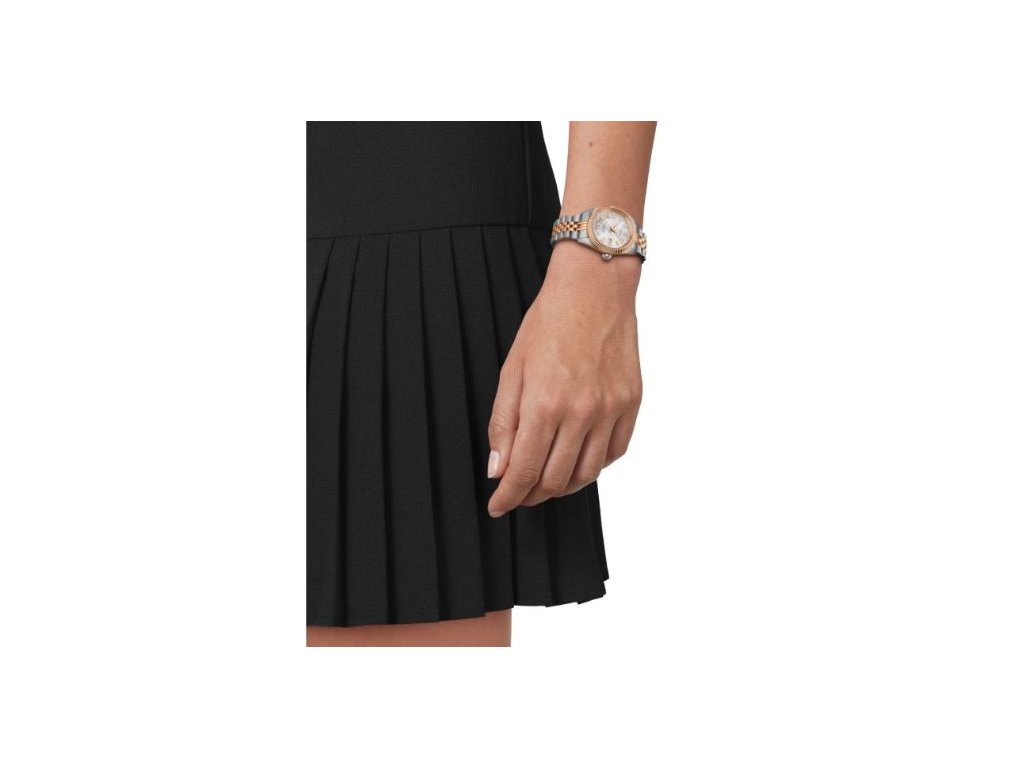 Dámské hodinky v ocelovém pouzdře s vroubkovanou lunetou poháněné automatickým strojkem. Stříbrný číselník s texturou zdobí římské číslice, ručičky mají luminiscenční nátěr Super-LumiNova. Hodinky pohání automatický strojek s rezervou chodu 48 hodi s C.O.S.C. certifikací, která je zárukou vysoké přesnosti.
