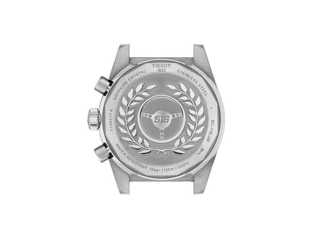 Tissot PR516 Chronograph s tenkým 40mm pouzdrem jsou moderní interpretací oblíbeného designu z roku 1970. Na modrém gradientním číselníku vynikají ručičky a indexy potažené bílou Super-LumiNova®. Luneta je vybavena praktickým tachymetrem. Jako odkaz na závodní historii Tissot zdobí zadní část pouzdra rytina stylizovaného historického sportovního volantu orámovaného věncem vítěze.