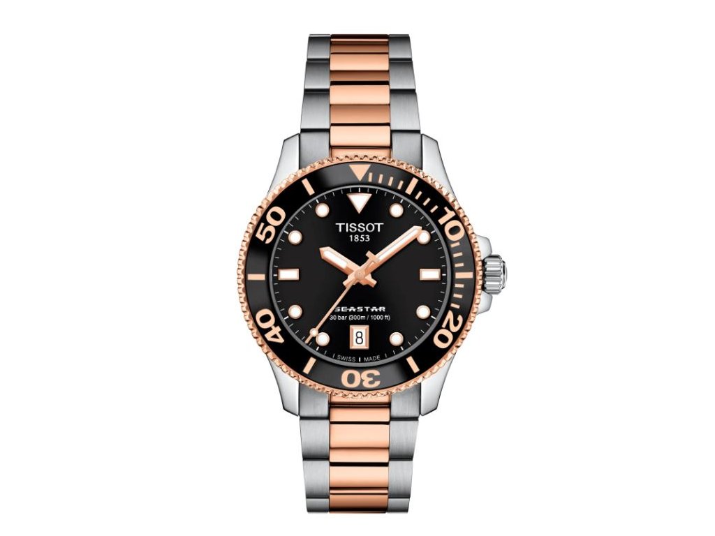 Dámské sportovní hodinky v celoocelovém provedení s PVD povrchovou úpravou v barvě růžového zlata v bicolor provedení. Na černém číselníku vynikají indexy a ručky s luminiscenční výplní Super-LumiNova®.