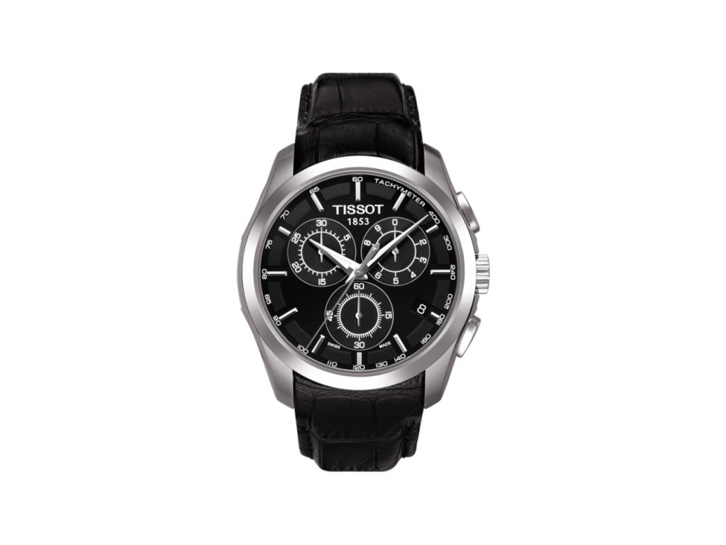 Pánské sportovní hodinky TISSOT Couturier. Pouzdro o průměru 41mm je vyrobeno z oceli, skrývá v sobě bateriový strojek Eta G10.211 a je usazeno na koženém řemínku. Číselník je chráněn safírovým sklíčkem. Hodinky mají vodotěsnost 100m.