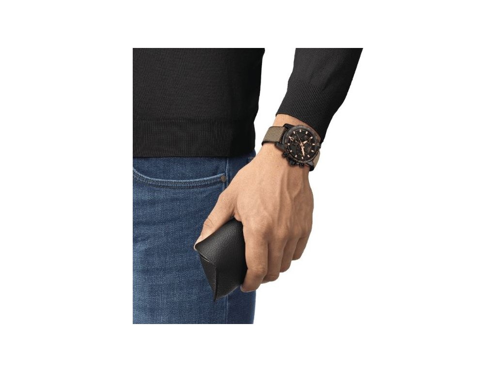 Pánské sportovní hodinky TISSOT Supersport Chrono v ocelovém pouzdře s černou PVD povrchovou úpravou. Číselník je chráněn safírovým sklíčkem. Velikost pouzdra je 46 mm. Hodinky mají vodotěsnost 100M. Ručky i indexy jsou opatřeny luminiscenční vrstvou SuperLuminova.