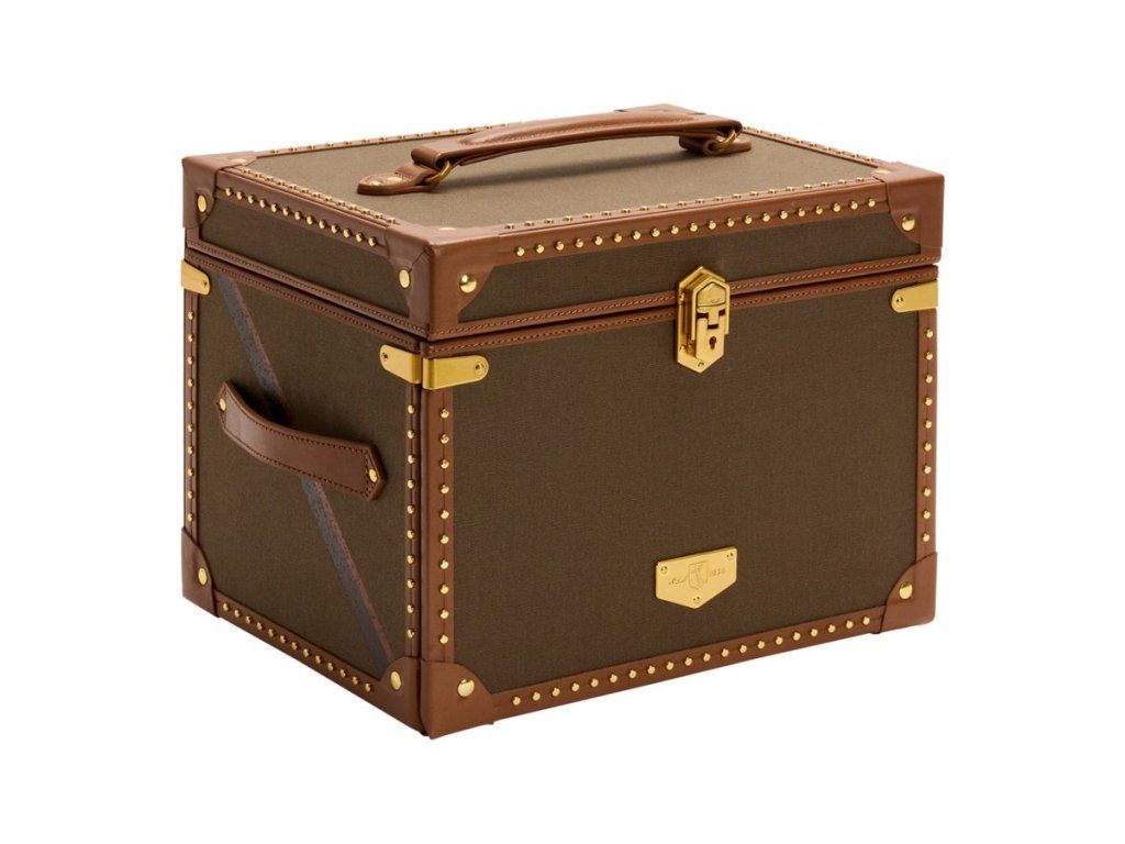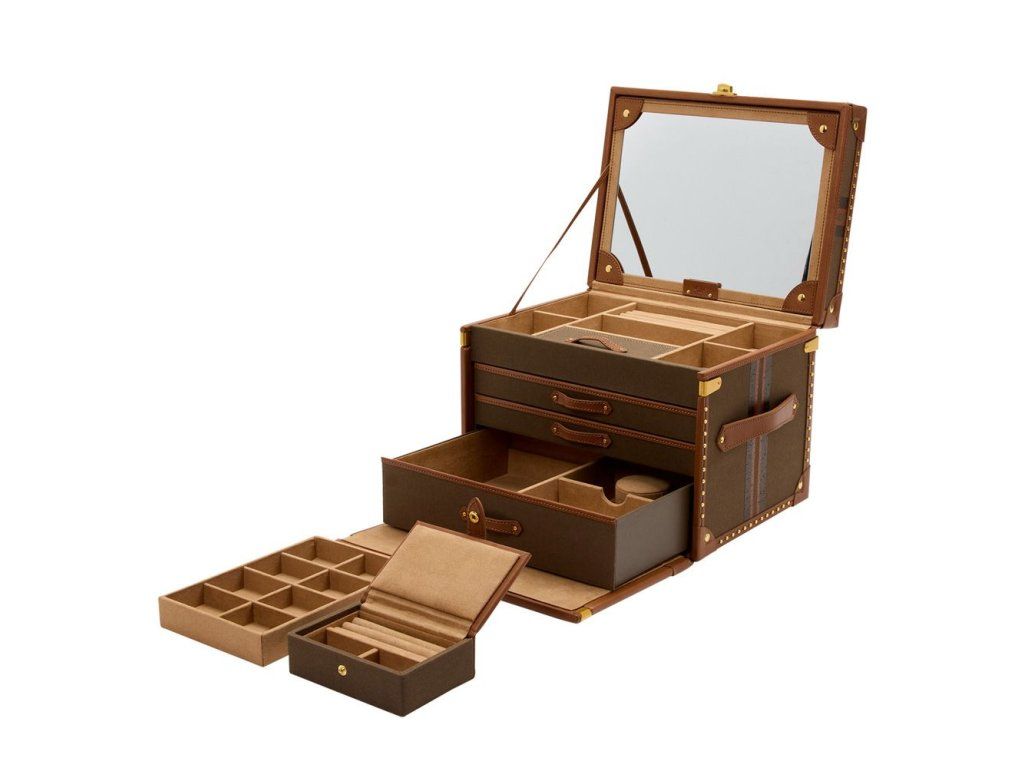 Šperkovnice Ida ve stylu kufru s vnějším povrchem z recyklovaného plátna v luxusních tlumených tónech s lemováním z vysoce kvalitní kůže, mosaznými cvočky, speciálním zámkem a exkluzivní cedulkou s logem 190. výročí. Vnitřní podšívka z ultrasemiše s úpravou LusterLoc™ nabízí několik přihrádek, otvory na prsteny, kryté přihrádky a tři zásuvky s přihrádkami, včetně malého cestovního pouzdra.