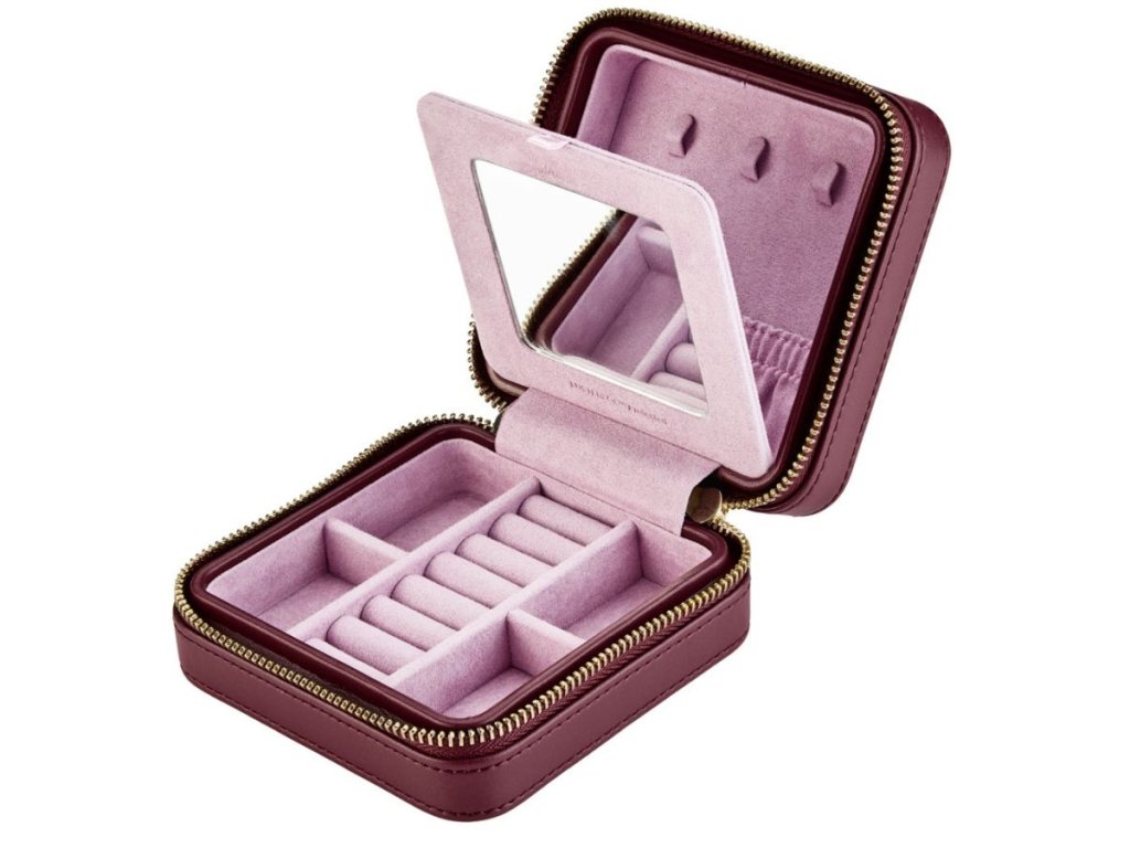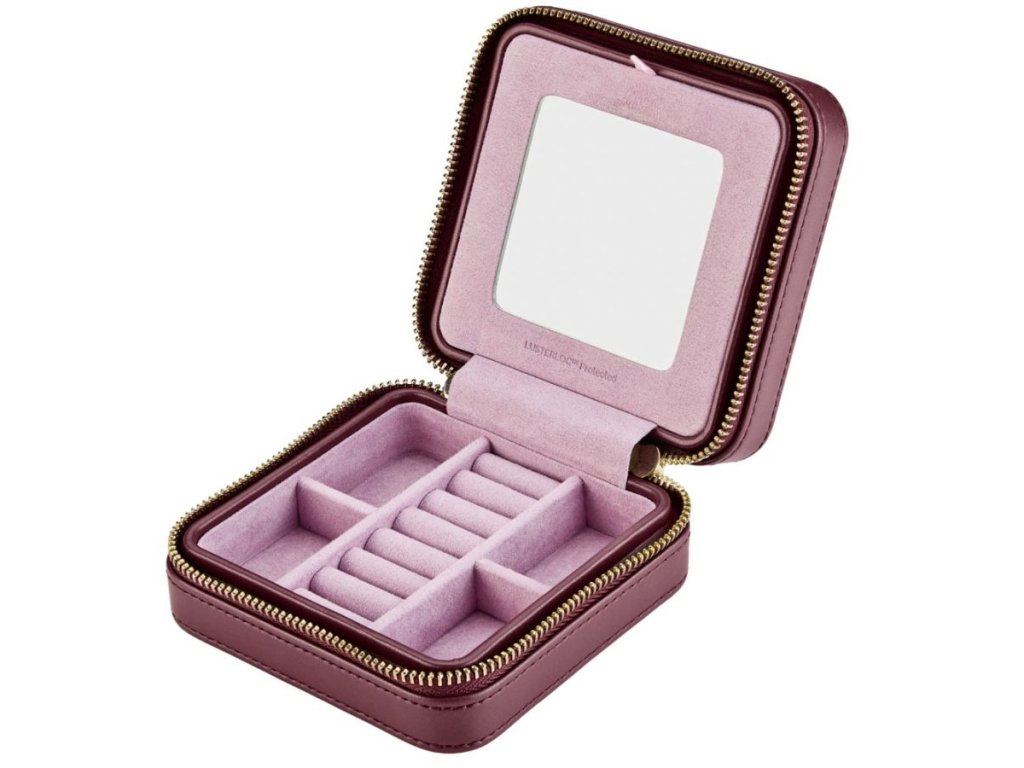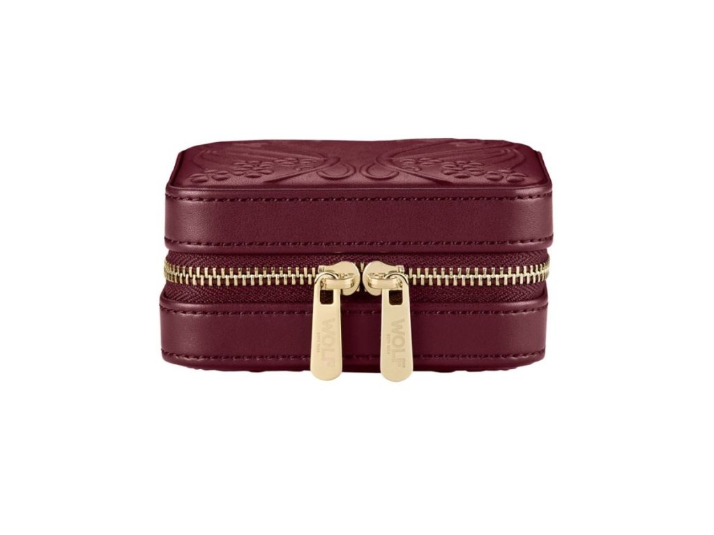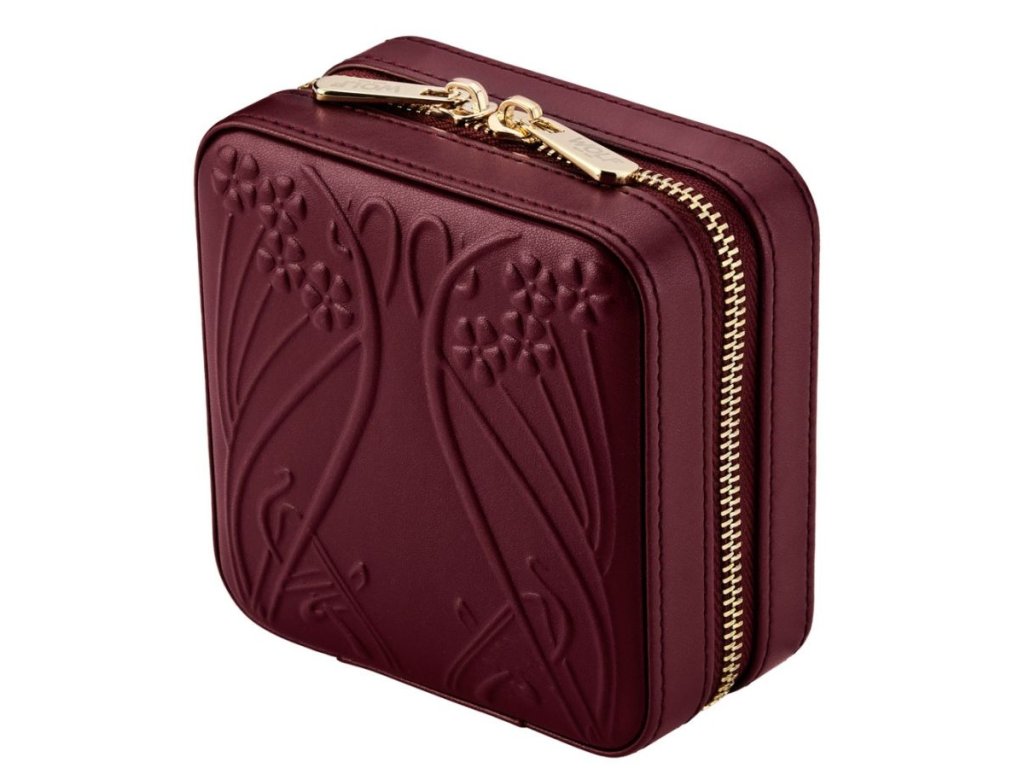 Malá šperkovnice na zip navržena pro elegantní uspořádání šperků na cestách ve vínové barvě s reliéfním ikonickým designem Liberty Ianthe.