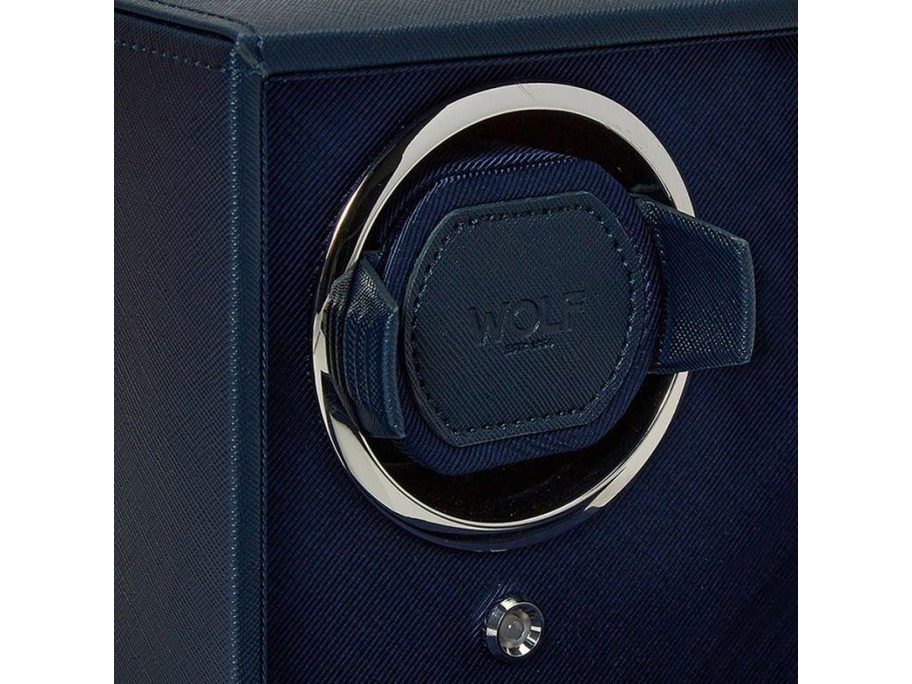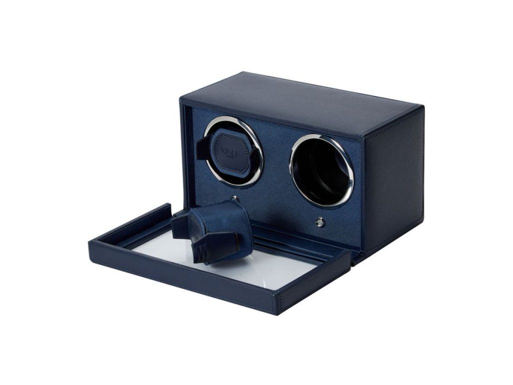 Vkusný a jednoduchý natahovač pro dva kusy hodinek v kůži modré barvy s chromovými prvky. Patentovaná zamykací manžeta bezpečně uchytí hodinky do bubnu rotátoru, pěna v manžetě má nízkou hustotou, a tak nevyvíjí tlak na náramek. Poháněný ze sítě nebo pomocí AA baterií. 900 otáček za den.