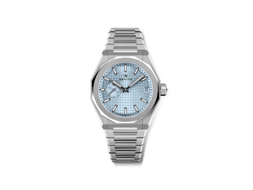 DEFY Skyline v ocelovém osmihranném pouzdře s fazetovanou lunetou s ledově modrým číselníkem se vzorem, který připomíná symbolickou čtyřcípou hvězdu ZENITH. Součástí balení je modrý pryžový řemínek.