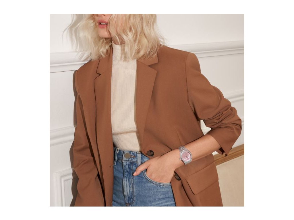 DEFY Skyline v ocelovém osmihranném pouzdře s fazetovanou lunetou s jemně růžovým číselníkem se vzorem, který připomíná symbolickou čtyřcípou hvězdu ZENITH. Součástí balení je růžový vzorovaný pryžový řemínek.