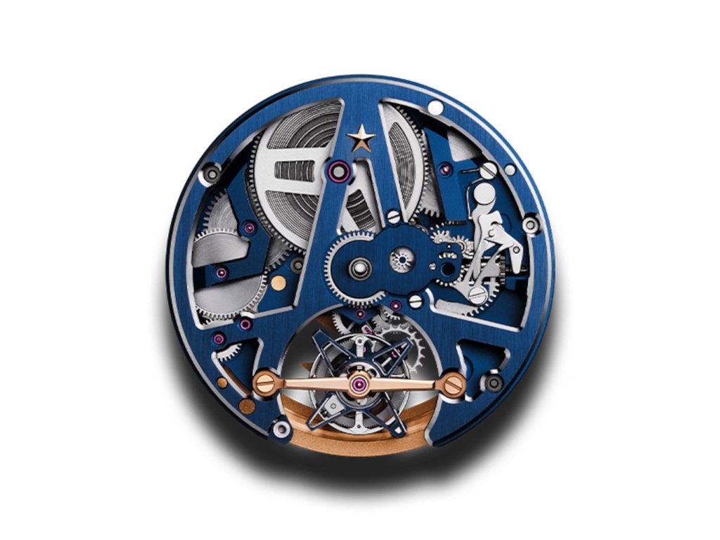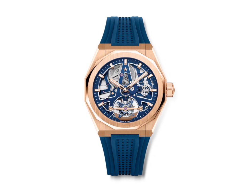 DEFY Skyline Tourbillon v osmihranném pouzdře z 18ti karátového růžového zlata s fazetovanou lunetou, ve kterém vyniká modrý skeletový číselník. Tento model je vyroben v limitované edici 50 kusů. Součástí balení je modrý kaučukový řemínek, který lze snadno vyměnit pomocí chytrého systému rychlé výměny.